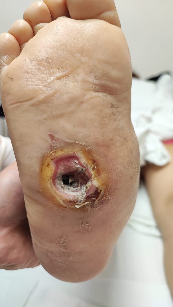 También existe la posibilidad de que el paciente tenga importantes alteraciones en la circulación y la microvasculatura de sus pies, lo cual lo lleve a presentar lesiones que son conocidas como ulceras diabéticas estas se caracterizan por ser lesiones crónicas que pueden ser ulceras no complicadas o ulceras infectadas y/o necróticas.